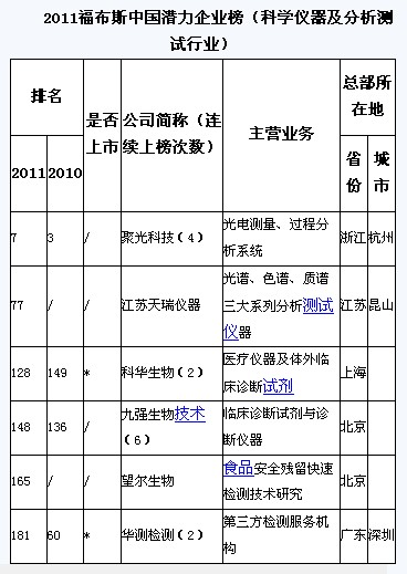 2011年1月10日,《福布斯》中文版在上海發(fā)布其年度首份榜單——2011中國(guó)潛力企業(yè)榜,聚光科技、江蘇天瑞儀器、望爾生物、華測(cè)檢測(cè)等多家科學(xué)儀器及分析測(cè)試行業(yè)企業(yè)入選“2011福布斯中國(guó)潛力企業(yè)榜”。
