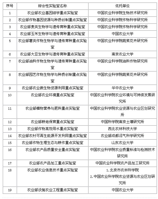 農(nóng)業(yè)部重點(diǎn)實(shí)驗(yàn)室建設(shè)(第二批)依托單位名單公示