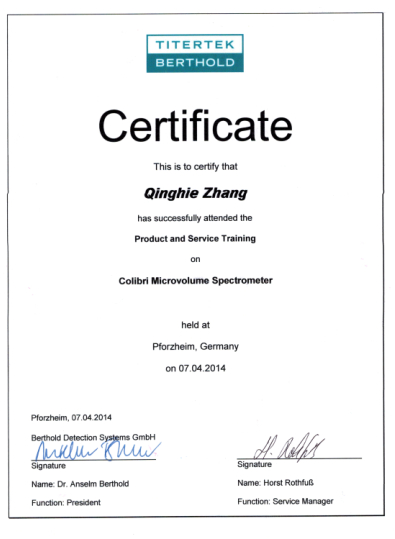 在4月份廣州市深華生物技術(shù)有限公司在總經(jīng)理張清杰的帶領(lǐng)下一行三人參加了第24屆Analytica 2014德國慕尼黑實(shí)驗(yàn)室分析生化儀器展。在德國伯赫公司的工廠接受了產(chǎn)品培訓(xùn),(Titertek Berthold是一家擁有35年歷史的著名生命科學(xué)儀器制造廠商,是專注于樣品處理、自動工作站和樣品檢測的高科技公司,總部和研發(fā)生產(chǎn)基地設(shè)在美國Huntsville和德國Pforzheim),廣州深華公司也成功獲得德國伯赫Titertek Berthold產(chǎn)品售后培訓(xùn)資格證書。