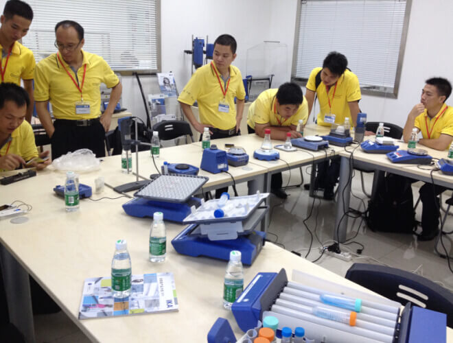 在儀器展示區(qū),IKA技術(shù)人員針對不同產(chǎn)品,就類別、原理、功能、技術(shù)參數(shù)、維修保養(yǎng)技巧,為我們銷售人員做了詳細解說。并給予現(xiàn)場演示操練時間。待廣州深華銷售人員徹底了解后,連連稱贊。兩家公司關(guān)系極其融洽。
